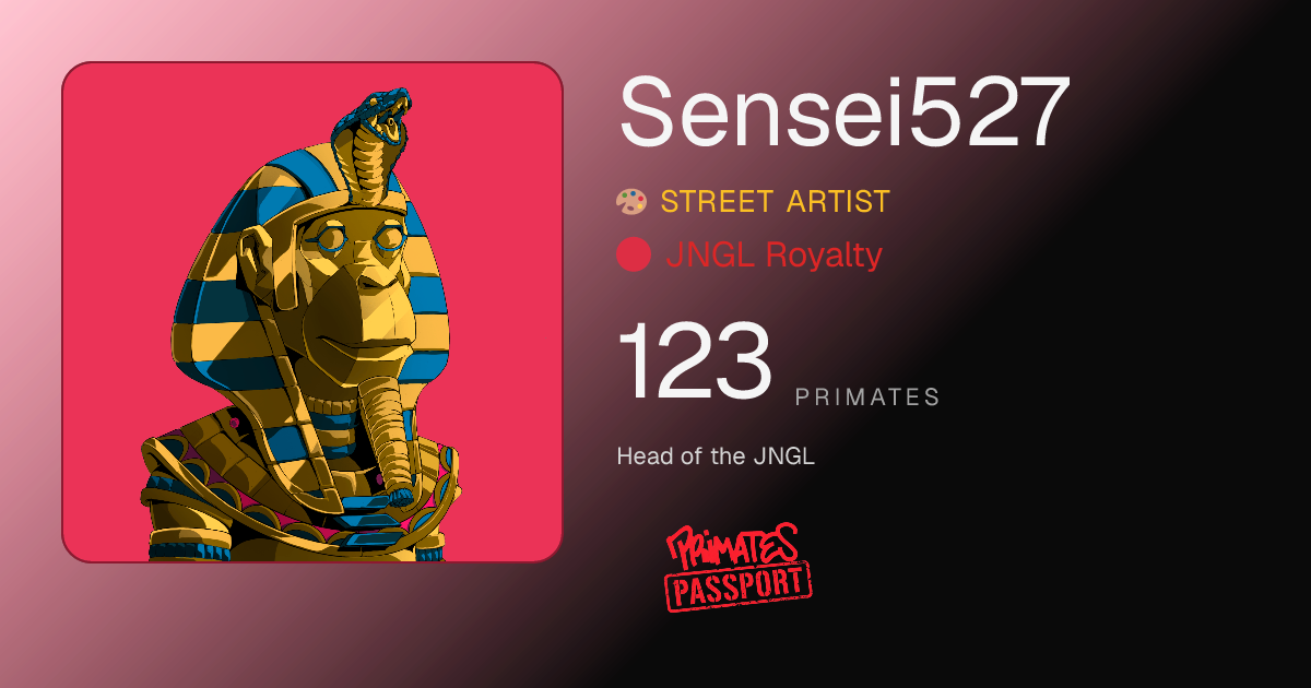 Primate #4186 ↗Sensei527🎨 Street Artist🔴 JNGL Royalty123PRIMATES120 staked3 listedHead of the JNGLMember sinceApr 25, 2026Wallets (1)2voio4...n67XOn-chain wallets verifying these holdings.Share PassportTweetDownload card